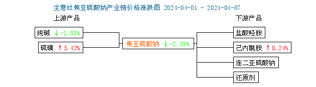 截至4月7日,國(guó)內(nèi)純堿價(jià)格偏弱運(yùn)行,整體下跌1.03%,硫磺價(jià)格小幅回升,整體上漲2.80%,綜合來(lái)看,原料成本整體仍處低位,純堿價(jià)格跌幅有所放緩,原料成本震蕩前行,后市焦亞硫酸鈉價(jià)格弱勢(shì)有望企穩(wěn)。