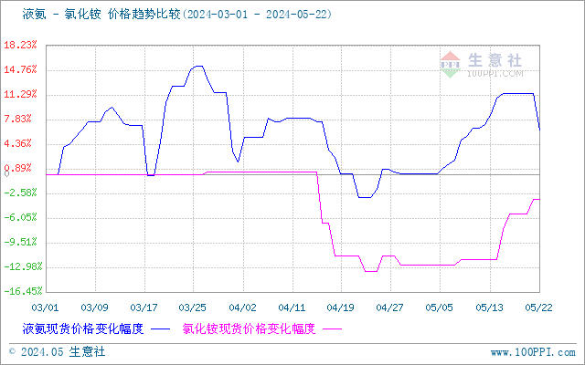 近日(5.13-5.22)液氨市場(chǎng)行情大幅上漲,氯化銨成本支撐走強(qiáng)。據(jù)生意社商品行情分析系統(tǒng)顯示,截至5月22日液氨價(jià)格在3320元/噸,較13日3190元/噸上漲了4.08%。