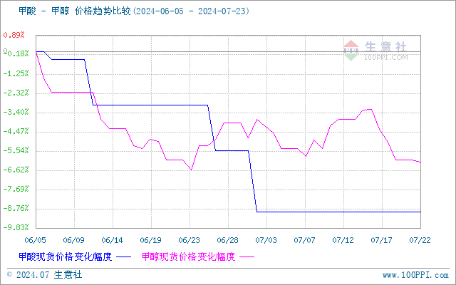 據(jù)生意社行情分析系統(tǒng)顯示,截止到7月23日甲酸企業(yè)報價均價為2678元/噸,與上月同期價格相比下跌6.02%,與7月初價格相比下跌3.53%,與上周相比價格穩(wěn)定。
